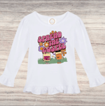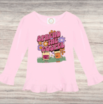 The shirt features charming ruffle accents along the hem and sleeves, adding a touch of playfulness to any outfit. Made from a soft, breathable cotton blend, this shirt ensures all-day comfort, allowing your child to move freely and comfortably.