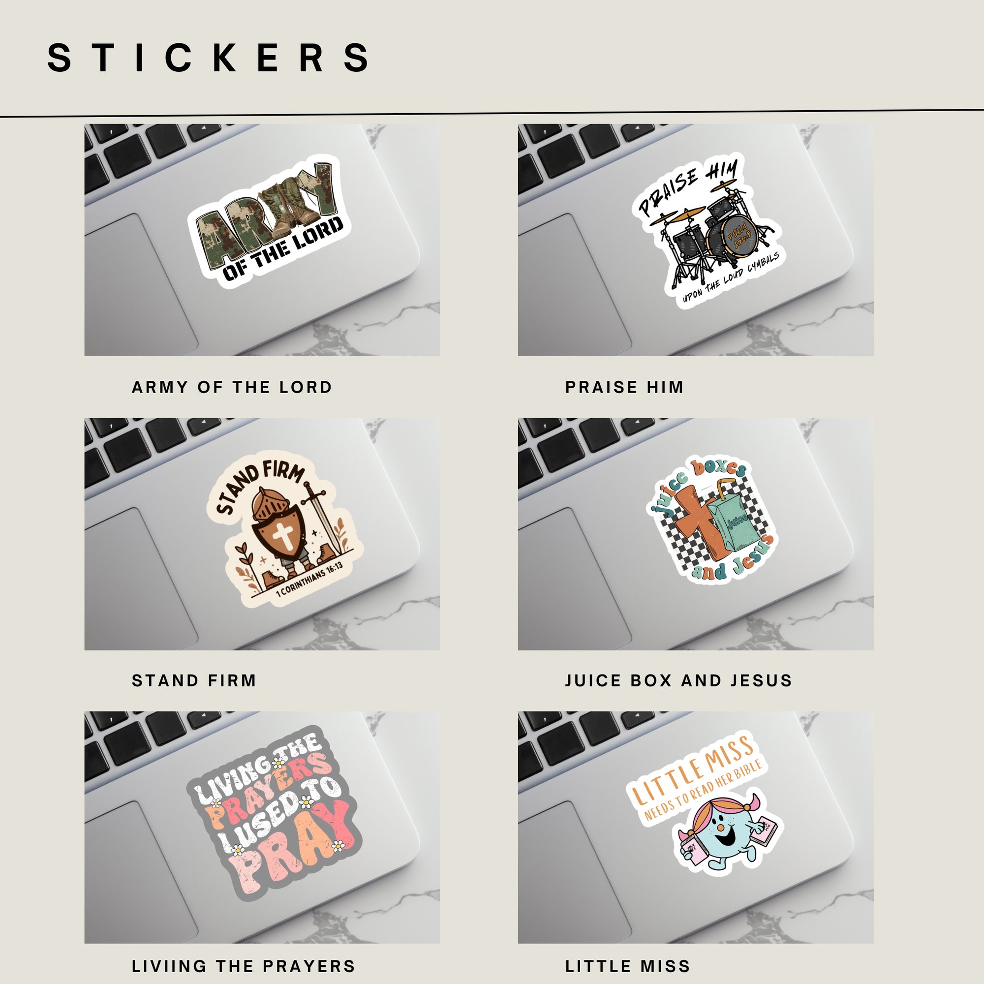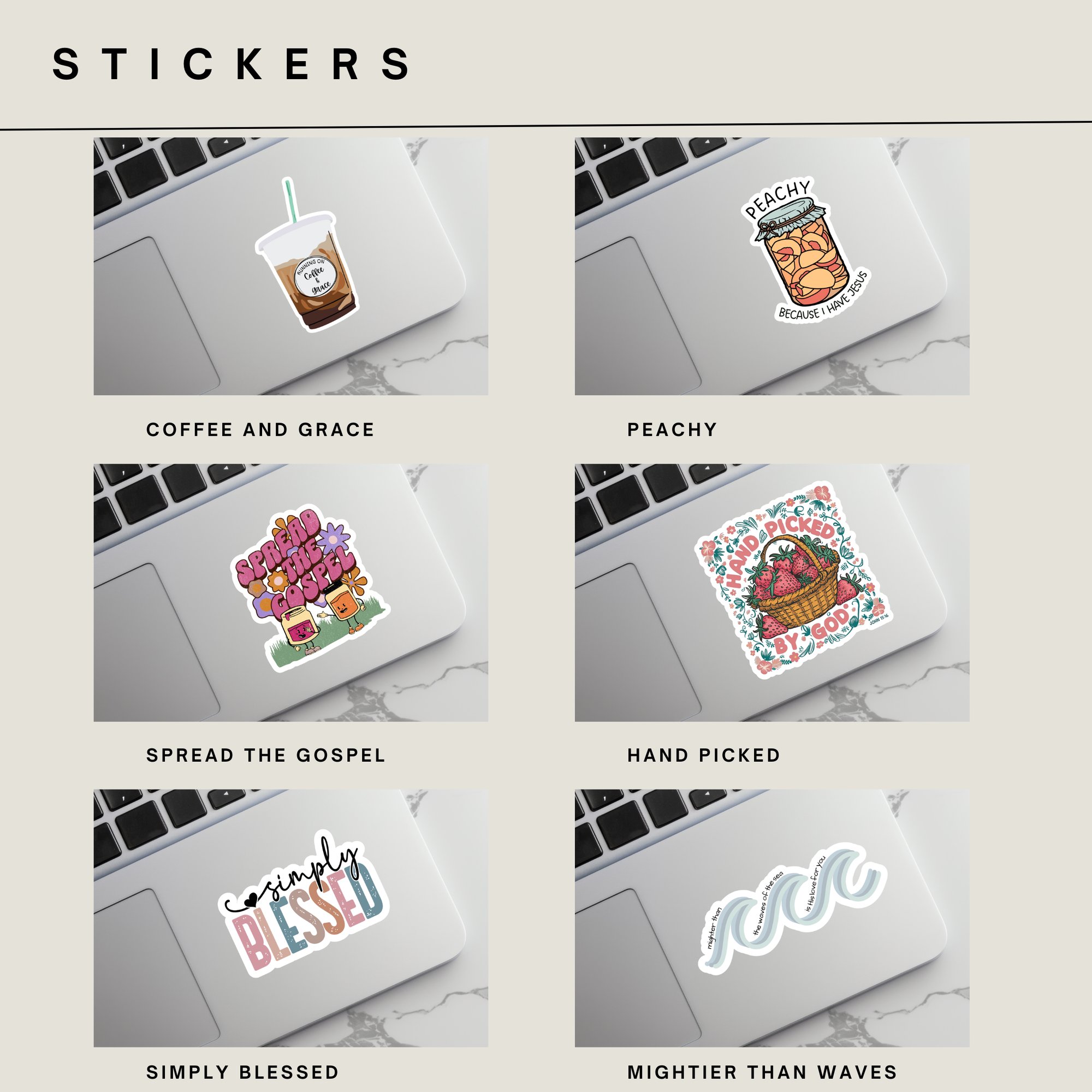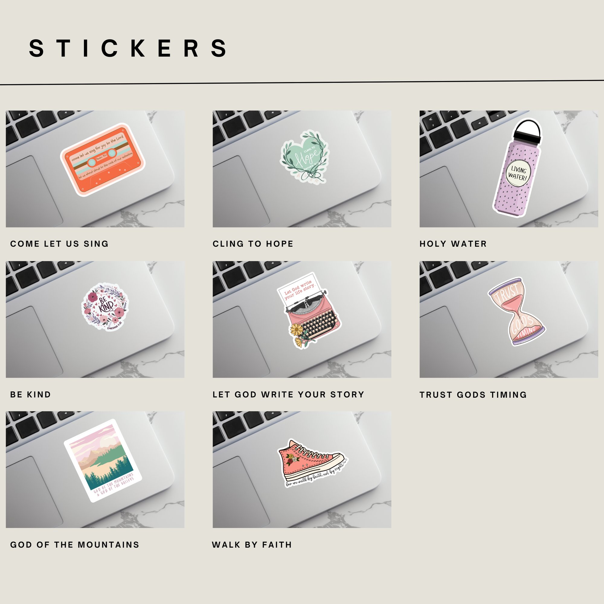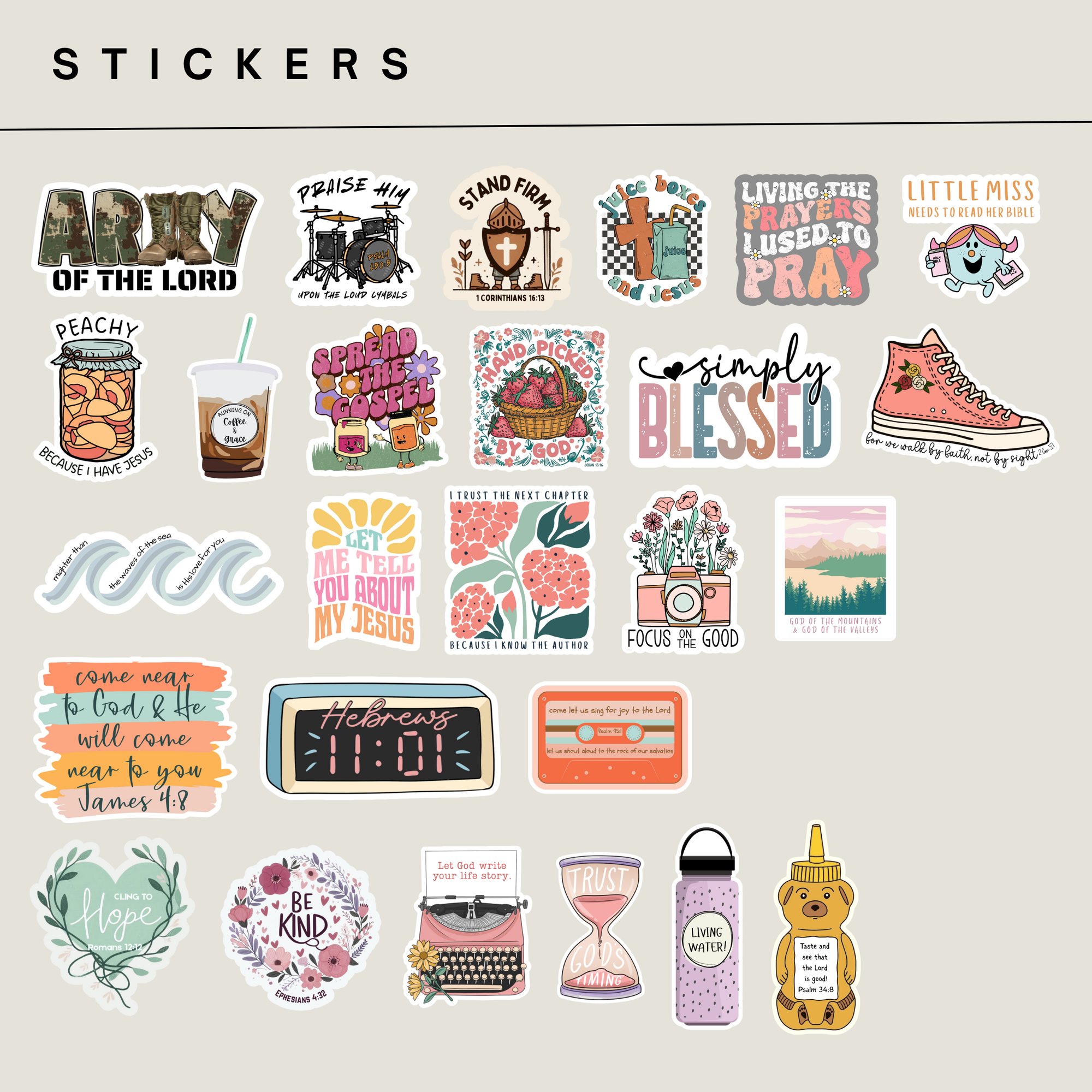 Add a touch of faith to your everyday life with our Faith-Inspired Sticker Collection — perfect for water bottles, journals, laptops, Bibles, and more! Each design is thoughtfully created to remind you of hope, love, and grace throughout your day.